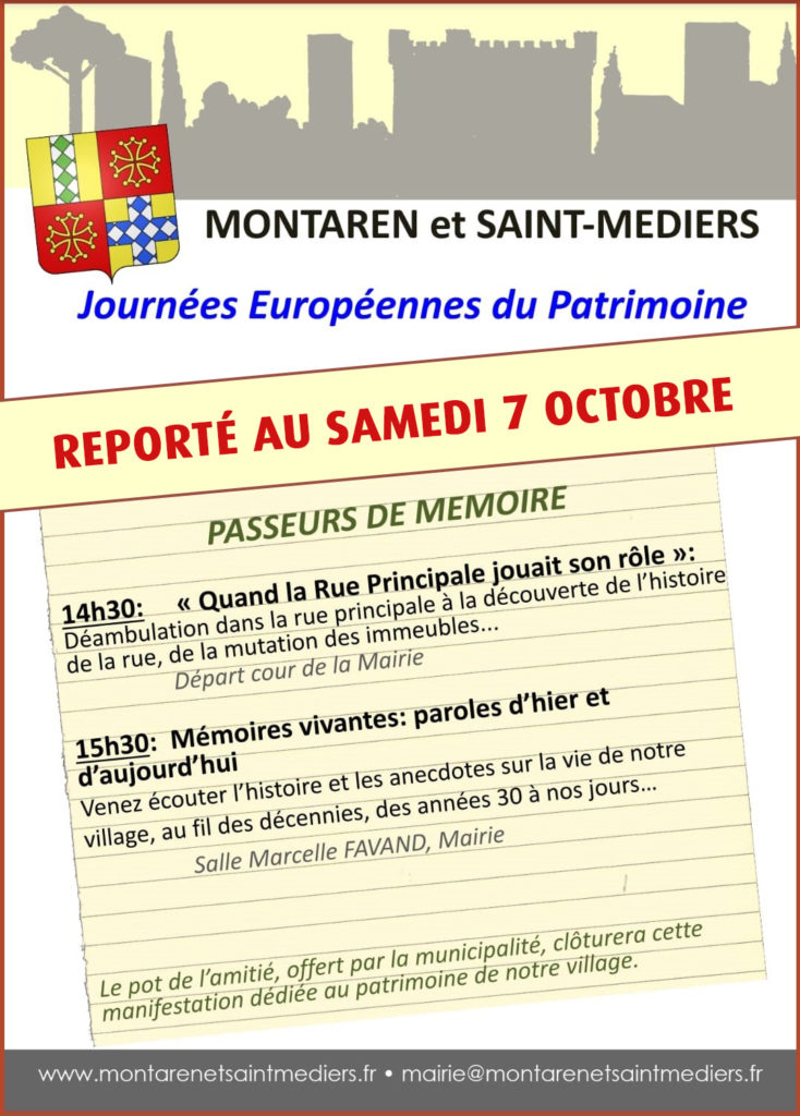 Report des journées du patrimoine. Publié le 15 septembre 2023 En raison de l’alerte orange reçu par la préfecture, les manifestations prévues lors des journées européennes du patrimoine du samedi 16 septembre sont reportés, non pas le 7 octobre, mais à une date ultérieure. Partagez : Lien Copié !