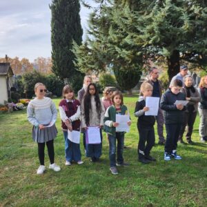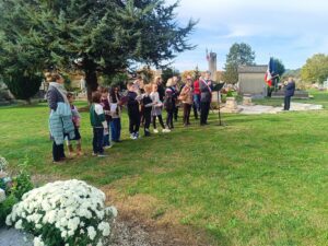 Moment fort de la commémoration : la lecture d’une lettre de poilu par les élèves de la classe de CM1/CM2 de Mme Maréchalle, un passage qui a particulièrement touché l’ensemble des participants.