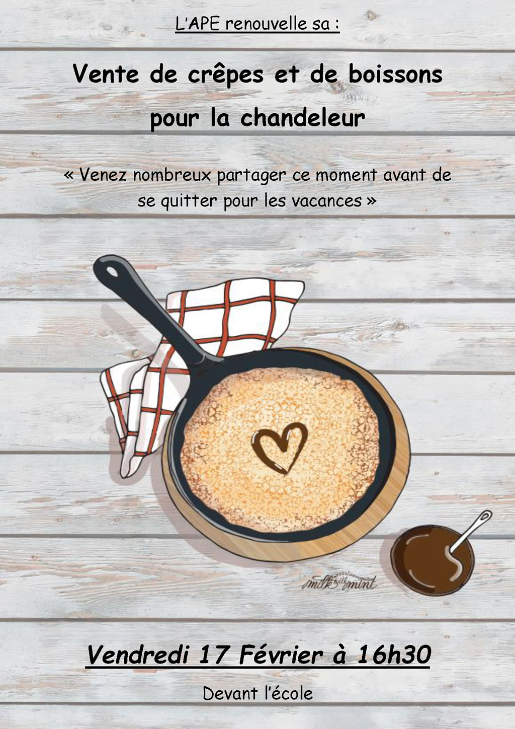 L’APE organise pour la chandeleur une vente de crêpes et de boissons devant l’école le Vendredi 17 Février 2023, à partir de 16h.